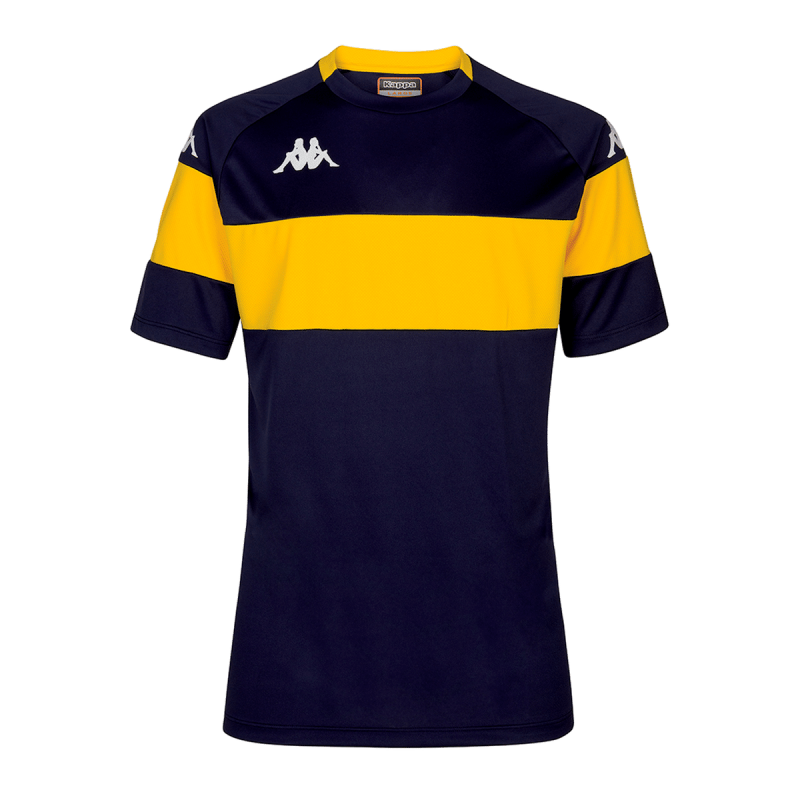 Maillot de match et d'entraînement homme 100% polyester, SLIM FIT, matière traitée spécifiquement pour évacuer la transpiration, manches courtes, col rond bande colorée sur le devant du maillot et sur les manches. Omini sur la poitrine et les manches.